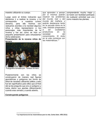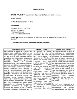 El documento describe una lección sobre polígonos en una escuela primaria colombiana que integró el tema con la celebración navideña. Los estudiantes observaron un video sobre figuras geométricas navideñas, identificaron polígonos en objetos navideños, y jugaron formando polígonos con su cuerpo. Luego participaron en una presentación navideña y construyeron árboles de navidad con pitillos para representar polígonos. Al final, los estudiantes demostraron haber aprendido a diferenciar polígonos cerrados de abiert
