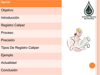 Este documento describe diferentes tipos de registros caliper, incluyendo caliper mecánico, electromagnético, multifinger y ultrasónico. Explica que un registro caliper mide continuamente el diámetro y forma de un pozo a lo largo de la profundidad usando brazos articulados. Los registros caliper proporcionan información sobre la condición del pozo que se usa para interpretación de datos y detección de deformaciones o corrosión.