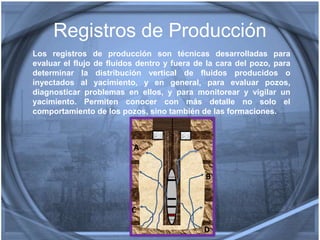 Los registros de producción son técnicas para evaluar el flujo de fluidos dentro y fuera de pozos. Permiten conocer el comportamiento de los pozos y las formaciones mediante el uso de herramientas como medidores de flujo, calipers, gradiomanómetros, termómetros, manómetros e hidrófonos. Los registros PLT se usan para diagnosticar problemas en pozos productores e inyectores, determinar zonas productoras o receptoras, y definir perfiles de flujo.