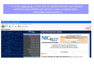 El documento explica los 8 pasos para registrar un dominio .com.ar en NIC.ar y redireccionarlo a un blog usando el servicio CDmon: 1) registrar el dominio en NIC.ar, 2) registrarse en CDmon, 3) copiar la configuración DNS de CDmon a NIC.ar, 4) especificar el ISP, 5) especificar el contacto técnico, 6) confirmar los datos, 7) una vez aprobado, configurar la redirección DNS en CDmon, 8) ingresar la URL del blog y guardar la redirección.