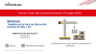 El documento presenta información sobre el registro en la fase de ejecución de proyectos de inversión pública utilizando los formatos 08-A y 08-C. Explica que estos formatos permiten registrar modificaciones realizadas antes y durante la ejecución física de los proyectos. También describe los pasos para acceder a estos formatos y realizar los registros correspondientes en cada sección, resaltando la importancia de coordinar entre las unidades ejecutoras y la unidad formuladora. Finalmente, brinda detalles sobre cómo registrar diferentes tipos de