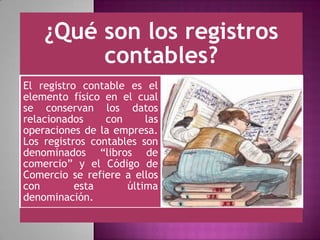 Los registros contables son documentos donde se registran las operaciones económicas de una empresa y sirven para controlar los activos, pasivos y el patrimonio. Entre los registros obligatorios se encuentran el libro diario, libro de inventarios y balances, y libro mayor. Los registros contables proveen información sobre la situación financiera y económica de la empresa y son elementos probatorios ante terceros.