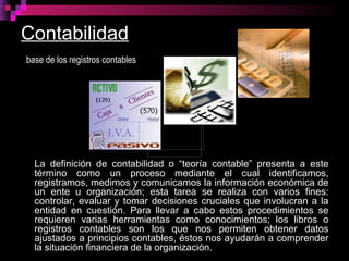 El documento describe los registros contables y la contabilidad como el proceso de identificar, registrar, medir e informar la información financiera de una entidad. Explica que los libros contables como el diario y el mayor permiten registrar las operaciones y saldos de cuentas para elaborar los estados financieros finales, los cuales proporcionan información sobre la rentabilidad, posición financiera, capacidad de crecimiento y flujo de fondos de la entidad. También enumera algunas cuentas y otros registros contables importantes.