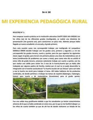 Este documento presenta 8 registros de la práctica pedagógica rural de un estudiante de la Escuela Normal Superior de Popayán. En los registros, el estudiante describe las clases y actividades realizadas con estudiantes de diferentes grados, incluyendo temas de matemáticas, ciencias naturales, y sociales. El estudiante utilizó varios materiales didácticos y estrategias como salidas al exterior y manipulación de objetos para hacer las clases más dinámicas e interactivas.