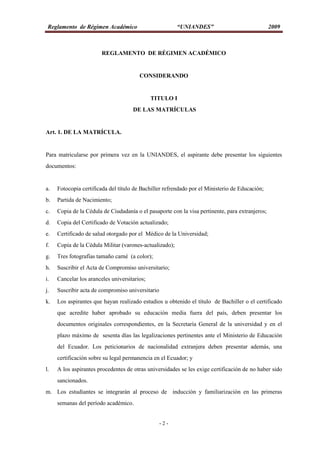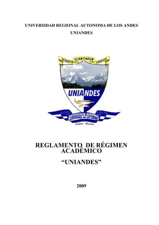 Este documento presenta el reglamento de régimen académico de la Universidad Regional Autónoma de Los Andes (UNIANDES) para el año 2009. Describe los requisitos para la matrícula de estudiantes, incluyendo documentos necesarios como el título de bachiller y certificados médicos y militares. También explica el sistema de créditos académicos de la universidad y la estructura de los planes de estudio, los cuales están definidos por créditos y competencias en diferentes ejes como el humanístico y el profesional.