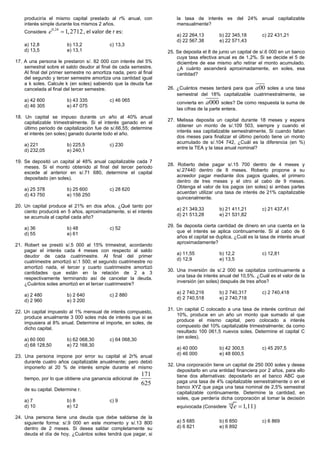 Este documento contiene 32 preguntas de aritmética sobre reglas de interés, tasas de interés compuestas y simples, capitalización continua y periódica, préstamos e inversiones. Las preguntas abarcan conceptos como capital inicial, intereses ganados, letras de pago, tasas nominales y efectivas, plazos fijos, entre otros.