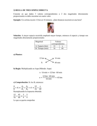El documento presenta la regla de tres, una herramienta matemática para resolver problemas de proporcionalidad directa e inversa entre magnitudes. Explica los conceptos de magnitudes directamente proporcionales, inversamente proporcionales y la regla de tres simple, compuesta y varios ejemplos de problemas resueltos usando esta regla.