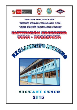 El documento presenta el reglamento interno de la Institución Educativa No 56021 de Rosaspata en Sicuaní. Establece las disposiciones generales, la organización de la institución, los órganos que la componen y las funciones de la directora, profesor de turno, personal docente y consejo educativo institucional. El objetivo principal es regular el funcionamiento de la institución y establecer pautas de desempeño para los miembros de la comunidad educativa.