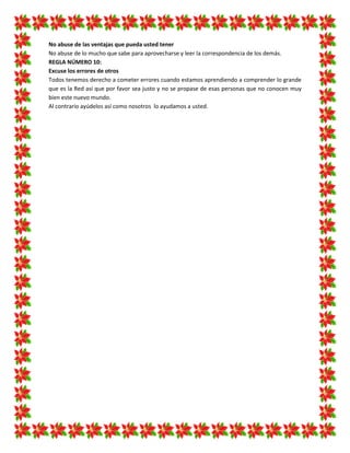 Este documento presenta 10 reglas de netiqueta para estudiantes. Las reglas enfatizan la importancia de ser respetuosos y evitar ofender a otros en línea, respetar la privacidad de los demás y compartir el conocimiento de manera honesta. También recomienda controlar las emociones, no abusar de la confianza o ventajas que se tengan, y excusar los errores de otros que están aprendiendo sobre el ciberespacio.