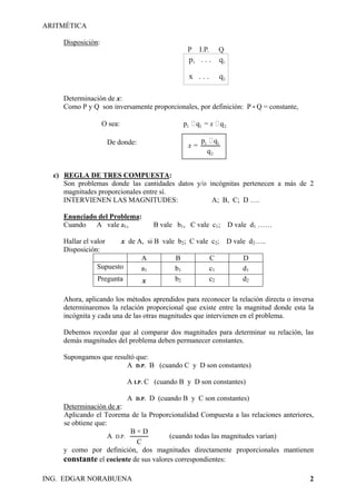 Este documento describe los diferentes tipos de regla de tres, incluyendo la simple directa e inversa, y la compuesta. La regla de tres simple involucra dos magnitudes proporcionales, mientras que la compuesta involucra más de dos. La regla de tres compuesta se usa para resolver problemas donde las cantidades de datos e incógnitas pertenecen a múltiples magnitudes proporcionales. Se provee un ejemplo de cómo calcular la cantidad de obreros necesarios para completar una cierta cantidad de obra en cierto tiempo usando la regla de tres compuesta.