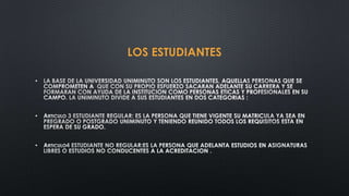 El documento presenta el reglamento estudiantil de Uniminuto. Establece los derechos y deberes de los estudiantes, incluyendo el buen comportamiento y excelentes resultados. Detalla los procesos de inscripción, selección, admisión y matrícula. Explica que la matrícula permite a los estudiantes recibir clases a cambio de cumplir con sus deberes, y que no matricularse puede hacer perder el estatus de admisión.