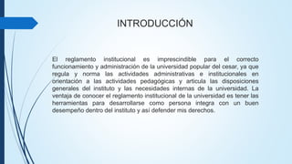 El documento presenta el reglamento estudiantil de la Universidad Popular del Cesar. Explica que el reglamento establece las normas y procedimientos para el funcionamiento de la universidad y define los derechos, deberes y obligaciones de los estudiantes y profesores. También describe algunas políticas específicas como las relativas a fraude académico, agresión física y transferencias entre programas. Concluye que el reglamento es fundamental para que los estudiantes puedan defender sus derechos y cumplir con sus responsabilidades en la universidad.