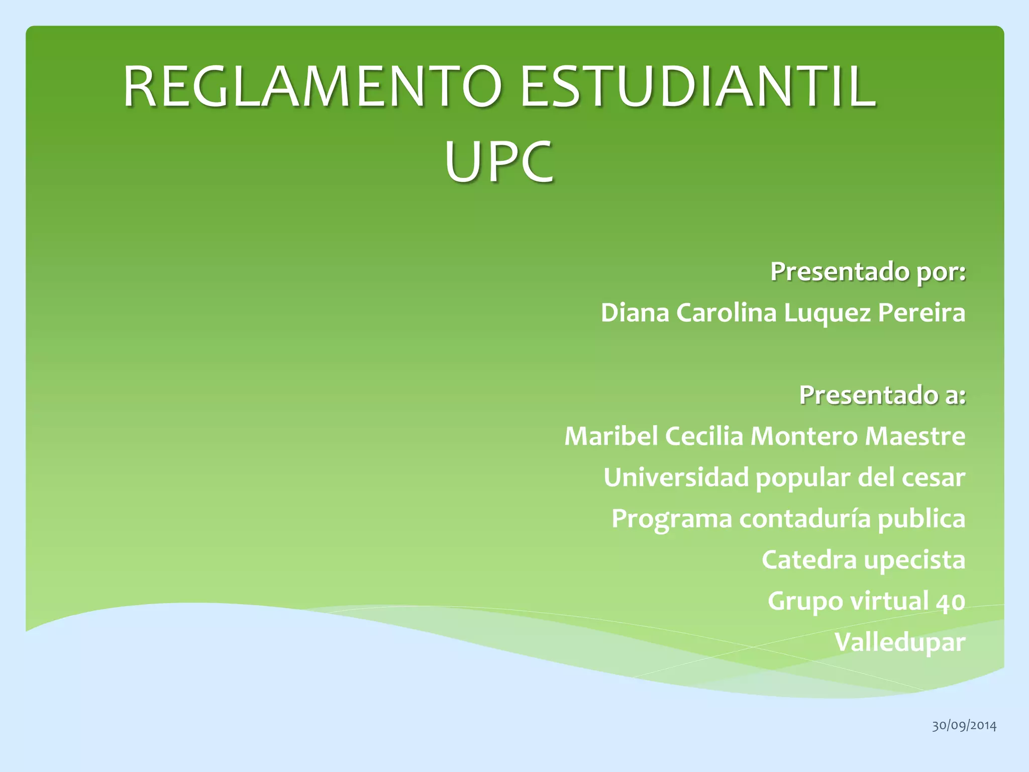 El documento detalla el reglamento estudiantil de la Universidad Popular del Cesar, describiendo su propósito de regular las relaciones y comportamientos dentro de la institución. Establece derechos y deberes de los estudiantes, además de procedimientos ante faltas académicas y disciplinarias. En conclusión, el reglamento promueve una convivencia basada en el respeto y proporciona claridad sobre las acciones a seguir en diversas situaciones.