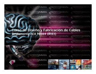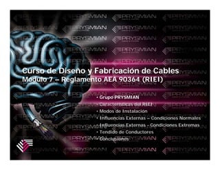 Este documento presenta un resumen de tres oraciones del curso "Diseño y Fabricación de Cables" sobre el Reglamento AEA 90364 (RIEI). El reglamento establece los requisitos técnicos para la realización e instalación de redes eléctricas internas en edificios. Incluye aspectos como los modos de instalación permitidos y prohibidos, las influencias externas a considerar, y la verificación periódica para garantizar la seguridad de las instalaciones.