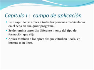 Este documento presenta los 12 capítulos del reglamento de los aprendices del SENA. Describe los derechos, deberes, prohibiciones, procesos de formación e incumplimiento, faltas, medidas, sanciones, procedimientos y representación de los aprendices. Entre otros aspectos, establece que los aprendices tienen derecho a recibir formación y certificación, así como deberes académicos y disciplinarios. También define faltas leves, graves o gravísimas, y las medidas y sanciones aplicables.