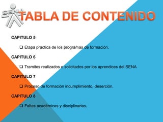 El documento habla sobre el proceso de formación de aprendices en el SENA, incluyendo diferentes etapas como la práctica, trámites realizados, incumplimientos y faltas. Describe los capítulos que tratan sobre estas etapas y procesos, así como las responsabilidades de los aprendices y consecuencias de incumplimientos o faltas.