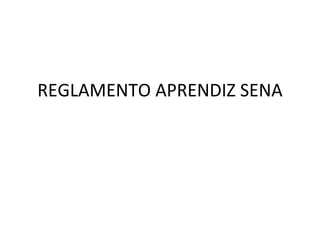 Este documento presenta el reglamento para aprendices del Servicio Nacional de Aprendizaje (SENA) de Colombia. Establece los derechos, deberes y prohibiciones de los aprendices, así como el proceso de formación, incumplimientos, faltas disciplinarias y medidas correctivas. Se compone de 12 capítulos que describen estos aspectos con el objetivo de promover una formación profesional integral de acuerdo con la ley.