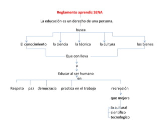 El documento presenta el reglamento para aprendices del Servicio Nacional de Aprendizaje (SENA) de Colombia. Establece los derechos, deberes y prohibiciones de los aprendices, así como el proceso de formación, incumplimientos, deserciones, faltas disciplinarias y las medidas correctivas. Se divide en 12 capítulos que describen cada uno de estos aspectos para garantizar una formación profesional integral de los aprendices acorde con los objetivos del SENA.