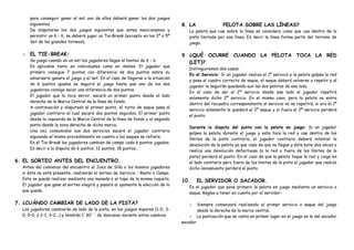 El documento describe las reglas y características básicas del tenis. Define las dimensiones de la cancha, las líneas de la pista, los accesorios fijos, y cómo se gana o pierde un punto. Explica el sistema de puntuación para juegos, sets y tie-breaks, así como los procedimientos para el saque y cambios de lado. También incluye consejos sobre la conducta y el equipamiento de los jugadores.