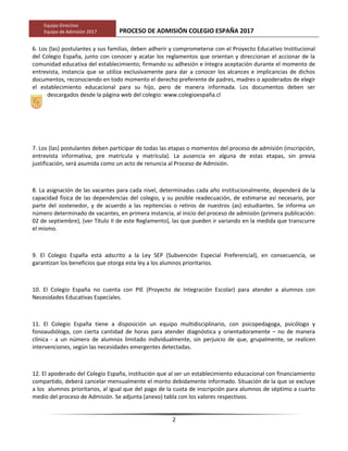 Este documento presenta el reglamento para el proceso de admisión del Colegio España para el año 2017. Establece que el proceso busca ser objetivo, transparente y respetuoso con los postulantes y sus familias. Detalla los niveles y cupos disponibles, los criterios de selección como prioridad para hermanos de estudiantes o hijos de ex alumnos, y que para primero a sexto básico no se considerará el rendimiento académico. También presenta el calendario del proceso, que incluye entrevistas in