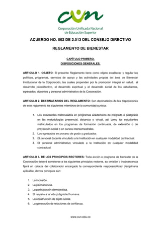 Este documento presenta el Reglamento de Bienestar de la Corporación Universitaria del Norte (CUN). Establece las políticas, programas y servicios de apoyo del área de Bienestar para promover la salud, desarrollo psicoafectivo, espiritual y social de estudiantes, egresados, docentes y personal administrativo. Define los destinatarios del reglamento y los principios rectores de inclusión, permanencia, participación democrática, respeto a la dignidad humana, construcción de tejido social y justicia. Además, present