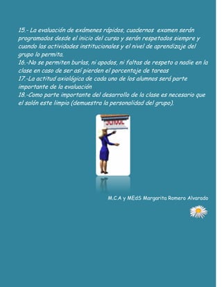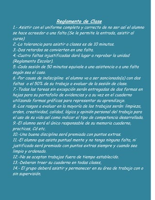 Este documento presenta las reglas y regulaciones de una clase. Incluye lineamientos sobre asistencia puntual, tareas, evaluaciones, disciplina, y comportamiento aceptable de los estudiantes. Los estudiantes deben asistir con uniforme, ser puntuales, entregar tareas a tiempo, y comportarse respetuosamente. El cumplimiento de las reglas será recompensado con puntos extras, mientras que las faltas o mala conducta resultarán en sanciones como faltas o la pérdida parcial de calificaciones. El salón