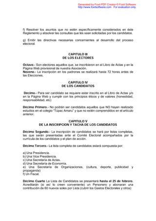 Este documento establece el reglamento para las elecciones internas de la Asociación de Ex Alumnos de la I.E. "Túpac Amaru" que se llevarán a cabo el 1 de marzo de 2008. Se describen los órganos electorales, los requisitos para ser elector y candidato, el proceso de inscripción y votación, el escrutinio y proclamación de resultados, y las normas para la campaña electoral.