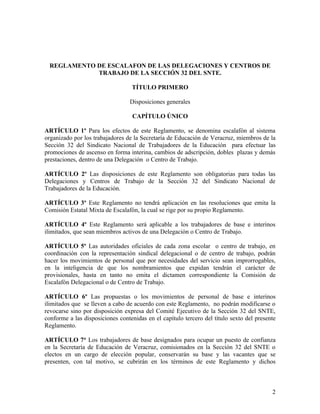 El documento presenta el Reglamento de Escalafón de las Delegaciones y Centros de Trabajo de la Sección 32 del Sindicato Nacional de Trabajadores de la Educación. Establece las disposiciones generales sobre el sistema de escalafón para promociones de ascenso y otras prestaciones. También describe la integración y atribuciones de la Comisión de Escalafón encargada de aplicar el escalafón considerando factores como antigüedad, conocimientos y participación sindical.