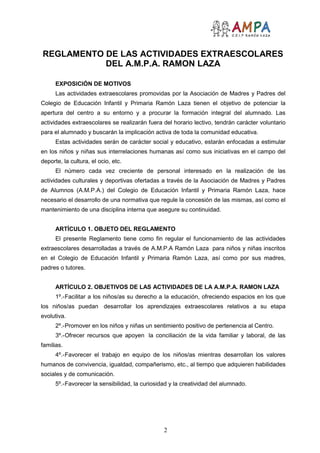 Este documento establece las normas y reglamentos para las actividades extraescolares organizadas por la Asociación de Madres y Padres del Colegio Ramón Laza. Detalla los objetivos de las actividades, los destinatarios, el proceso de inscripción, la asignación de plazas y turnos, el calendario, la organización, la suspensión de actividades, los derechos y deberes de los padres, y la programación y demostración de progresos. El objetivo principal es regular el funcionamiento de las actividades extraescolares para los ni