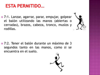 Este documento resume las reglas sobre cómo se puede jugar el balón en el fútbol. Se permite lanzar, agarrar, parar y golpear el balón con diferentes partes del cuerpo. El jugador solo puede tener el balón en sus manos por 3 segundos y dar 3 pasos con él. También se permite botar el balón y pasarlo de una mano a otra. El juego pasivo, o conservar el balón sin intentar atacar, está prohibido y se sanciona con un tiro libre para el equipo contrario.