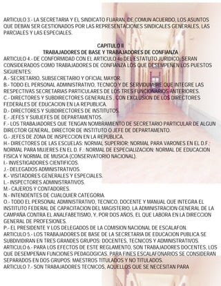 El reglamento de las condiciones generales de trabajo del personal de la Secretaría de Educación Pública establece derechos y obligaciones de los trabajadores, regulando su clasificación en trabajadores de base y de confianza, así como los procedimientos relacionados con nombramientos y promociones. También se detallan las jornadas de trabajo y las disposiciones para el cumplimiento de las normas laborales. Este reglamento fue publicado el 29 de enero de 1946 y es de observancia obligatoria para los empleados de la dependencia.