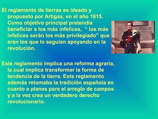 El reglamento de tierras propuesto por Artigas en 1815 tenía como objetivo beneficiar a los más desfavorecidos mediante una reforma agraria que buscaba recuperar la ganadería y fomentar una clase media rural. Se establecieron condiciones para la entrega de tierras a sectores vulnerables, incluyendo negros libertos, criollos pobres e indios, mientras se despojaba a europeos y otros grupos considerados 'malos'. La conclusión destaca que la revolución debía buscar la prosperidad de los menos privilegiados y frenar la violencia relacionada con la ganadería.