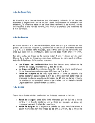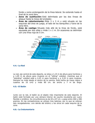 Este documento describe las reglas y características básicas del voleibol adaptado. Detalla las dimensiones y líneas de la cancha, incluyendo la zona de ataque, zona de saque y otras áreas. Explica que la red se coloca a diferentes alturas dependiendo del género y tipo de voleibol. También especifica los requisitos para el balón, la indumentaria de los jugadores, y las reglas básicas para el desarrollo de un partido como el número de sets y puntos necesarios para ganar.