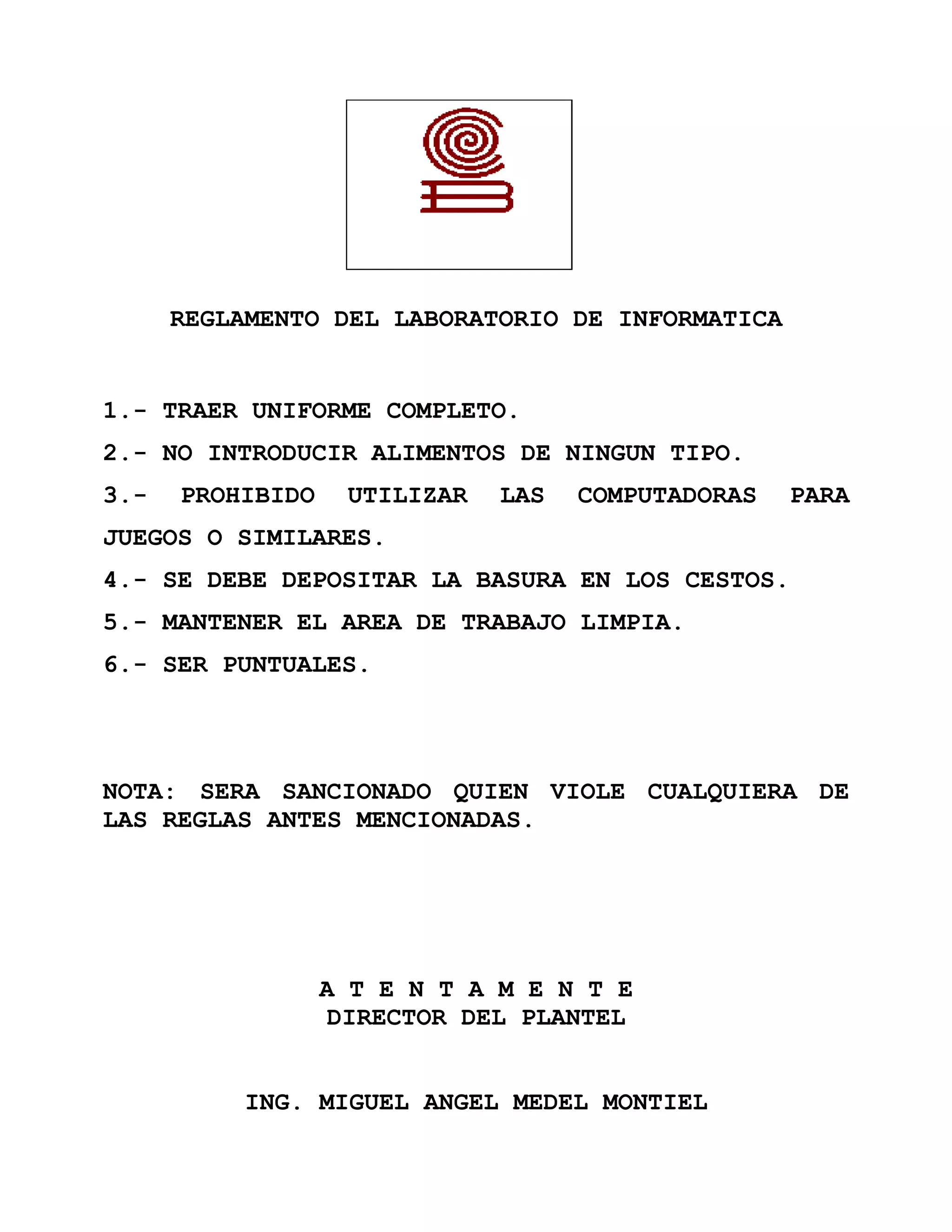 El reglamento del laboratorio de informática establece seis reglas que los estudiantes deben seguir: usar uniforme completo, no comer dentro del laboratorio, usar las computadoras solo para propósitos académicos, depositar la basura en los cestos, mantener limpio el área de trabajo y llegar a tiempo. Aquellos que violen cualquiera de estas reglas serán sancionados.