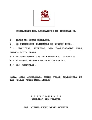 El reglamento del laboratorio de informática establece seis reglas que los estudiantes deben seguir: usar uniforme completo, no comer dentro del laboratorio, usar las computadoras solo para propósitos académicos, depositar la basura en los cestos, mantener limpio el área de trabajo y llegar a tiempo. Aquellos que violen cualquiera de estas reglas serán sancionados.