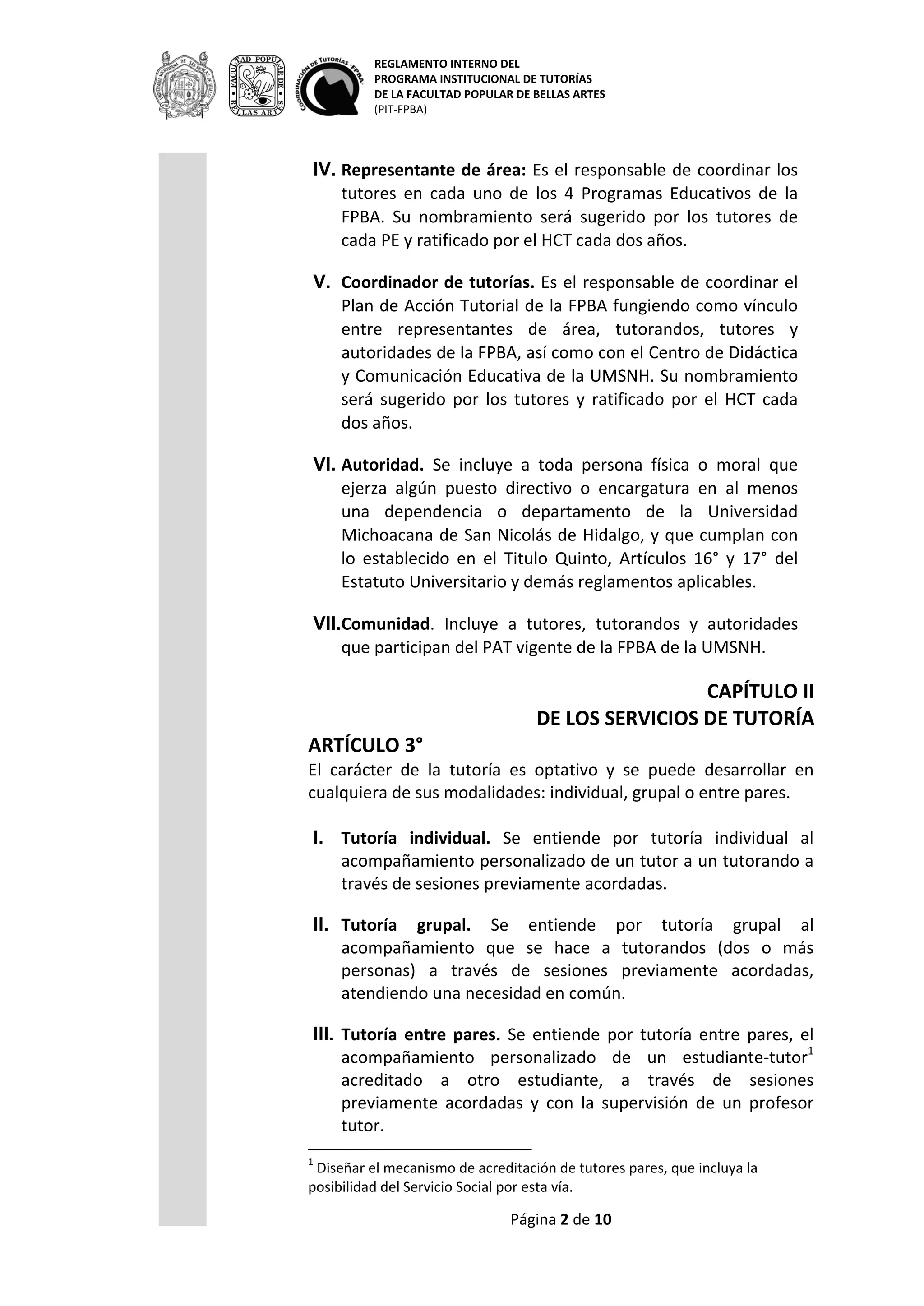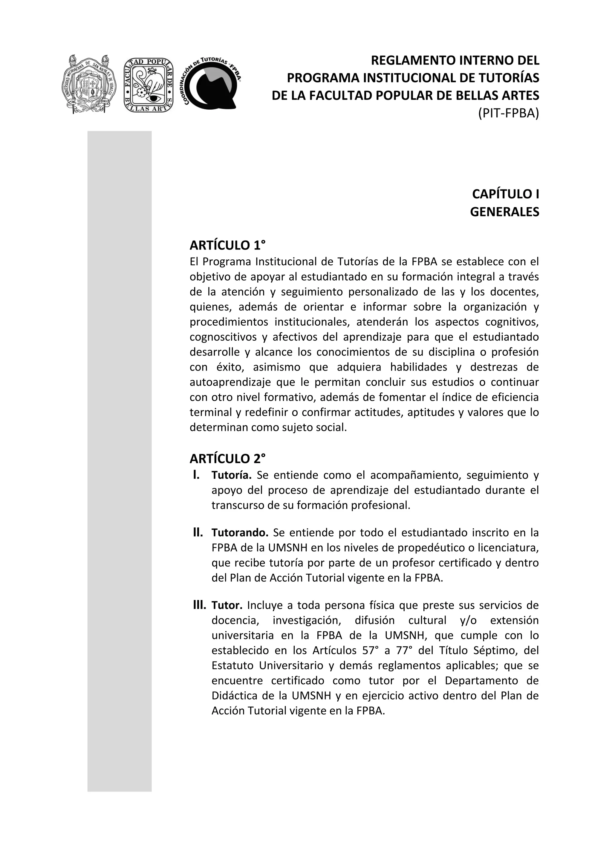 El documento presenta el reglamento interno del Programa Institucional de Tutorías de la Facultad Popular de Bellas Artes. El programa tiene como objetivo apoyar la formación integral del estudiantado a través de tutorías personalizadas. Define las modalidades de tutoría, los requisitos y obligaciones de tutores, tutorandos y autoridades involucradas. Finalmente, establece las sanciones aplicables por incumplimiento de lo establecido en el reglamento.