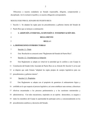 Este documento presenta una resolución del Senado de Puerto Rico para adoptar las reglas de procedimientos y gobierno interno del Senado. La resolución establece las reglas para la elección de funcionarios, las relaciones con la Cámara de Representantes, y los procedimientos y estructura del Senado.