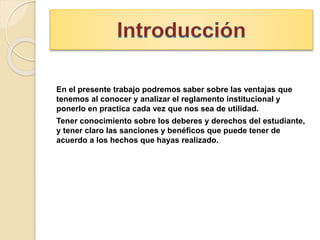 El documento explica que el reglamento institucional establece normas sobre aspectos académicos como la admisión, matrícula y titulación, y aspectos de desarrollo institucional como planificación, personal, evaluación y sanciones. El reglamento beneficia a estudiantes y docentes al coordinar y organizar los servicios de la institución y ayudar a los estudiantes a conocer sus deberes y derechos.