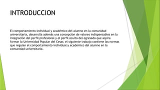 Este documento presenta el reglamento institucional de la Universidad Popular del Cesar, el cual regula las relaciones entre la universidad y sus estudiantes. El reglamento establece las obligaciones y derechos de los estudiantes y permite tratar casos específicos como fraude académico, agresión, asistencia a clases e invalidación de asignaturas. Conocer y aplicar el reglamento tiene ventajas como dar a conocer las obligaciones de los estudiantes y regular aspectos académicos como transferencias y cursos nivelatorios.