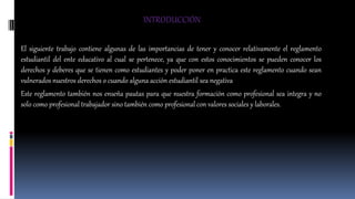 Este documento resume las principales ventajas y usos del reglamento estudiantil. Explica que el reglamento establece las normas de conducta que deben seguir estudiantes y profesores, así como las sanciones por violaciones. También cubre procedimientos como cambios de carrera y cancelación de cursos. El documento concluye que conocer el reglamento es muy útil para que los estudiantes conozcan sus derechos y deberes y para resolver posibles problemas académicos o disciplinarios.