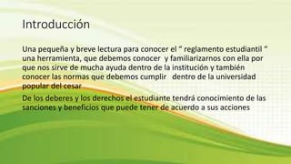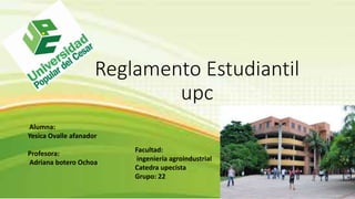 Este documento presenta un resumen del reglamento estudiantil de la Universidad Popular del Cesar. Explica que el reglamento establece las normas y deberes de los estudiantes, así como los tipos de sanciones por incumplimiento. Detalla que la agresión física a un profesor o compañero puede ser sancionada con la cancelación de la matrícula. También indica que el reglamento debe consultarse para trámites como la cancelación de materias, solicitud de certificados o ausencias justificadas por enfermedad.