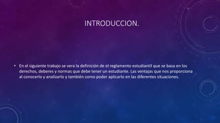 El documento describe el reglamento estudiantil de la Universidad Popular del Cesar. Explica que el reglamento establece las normas y derechos de los estudiantes, y las sanciones por violaciones. También detalla los procedimientos para cambiarse de programa, hacer trampa en un examen, y agredir a otro estudiante o profesor. Finalmente, enfatiza la importancia de que los estudiantes conozcan el reglamento para defender sus derechos.