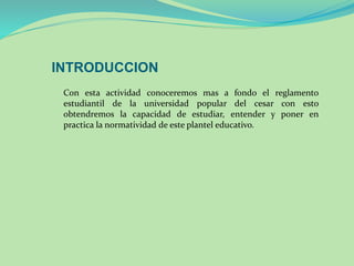Este documento resume el reglamento estudiantil de la Universidad Popular del Cesar. Explica que el reglamento establece las normas y deberes de la comunidad estudiantil para mantener el orden y regular las actividades de la universidad. También describe algunos procedimientos como cómo solicitar un cambio de carrera, las sanciones por fraude académico como obtener un cero en el examen, y las posibles sanciones por agredir físicamente a otro estudiante o profesor que pueden incluir amonestaciones, matrícula condicional o
