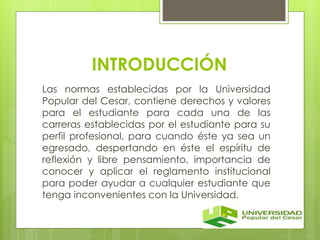 El documento presenta el reglamento estudiantil de la Universidad Popular del Cesar. Define el reglamento como un documento que establece normas para regular las actividades de los estudiantes y mantener el orden. Explica procedimientos como cambiar de carrera, qué hacer cuando un estudiante hace fraude en un examen, y las sanciones por agredir a otros. También presenta casos en los que un estudiante debe usar el reglamento con respecto a renovar la matrícula, presentar pruebas de habilitación, y solicitar una revisión de calificaciones