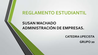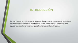 Este documento presenta un resumen del reglamento estudiantil de una universidad. Explica que el reglamento establece las normas de comportamiento para los estudiantes y el tipo de sanciones por violarlas. También describe algunas ventajas de conocer el reglamento, como entender cómo se evalúa el progreso académico y conocer los derechos y deberes de los estudiantes. Finalmente, presenta algunos ejemplos de cómo aplicar el reglamento en situaciones específicas como cambios de carrera o cuando un estudiante es