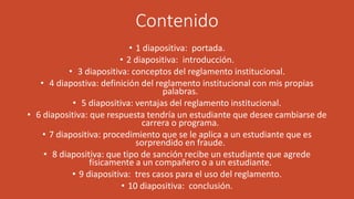 Este documento presenta un resumen del reglamento estudiantil de la Universidad Popular del Cesar. Explica los conceptos clave del reglamento, sus ventajas y cómo se aplica en diferentes situaciones como cambios de carrera, fraude académico y agresión física. También incluye tres casos en los que los estudiantes deben usar el reglamento y concluye que aprendió sobre los derechos, deberes y procesos establecidos en la institución.