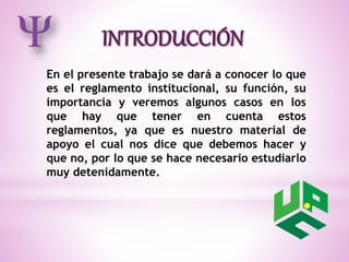El documento explica lo que es un reglamento institucional, su función y importancia. Indica que el reglamento establece normas y procedimientos para los miembros de una institución y regula su funcionamiento. Además, cita algunos artículos del reglamento de la UPC sobre transferencias entre carreras, sanciones por fraude y faltas contra el orden universitario. Concluye resaltando la importancia de conocer el reglamento de la propia institución.