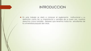 Este documento resume el reglamento institucional de una universidad, incluyendo definiciones, ventajas de conocerlo y aplicarlo, y procedimientos para casos como cambios de programa, fraude académico, agresión física, y situaciones en las que los estudiantes deben recurrir al reglamento.