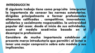 Este documento describe la importancia de conocer y aplicar el reglamento estudiantil de una universidad. Explica que el reglamento establece normas de conducta que deben seguir los estudiantes y define procedimientos sobre admisiones, cambios de carrera, exámenes y sanciones por infracciones. También provee ejemplos de cómo el reglamento puede aplicarse en casos de fraude académico, agresión física y solicitud de cancelación de cursos.