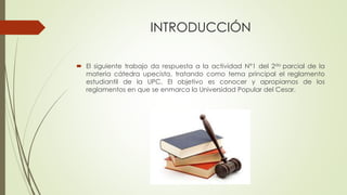 Este documento presenta un resumen del reglamento estudiantil de la Universidad Popular del Cesar (UPC). Explica que los reglamentos institucionales asignan deberes y derechos a la comunidad universitaria y regulan las actividades de la universidad. Luego, detalla algunas normas sobre cambios de programa, fraude académico, agresiones físicas y situaciones en las que los estudiantes deben consultar el reglamento. Concluye que el reglamento es una herramienta importante que guía las decisiones en la universidad y perm